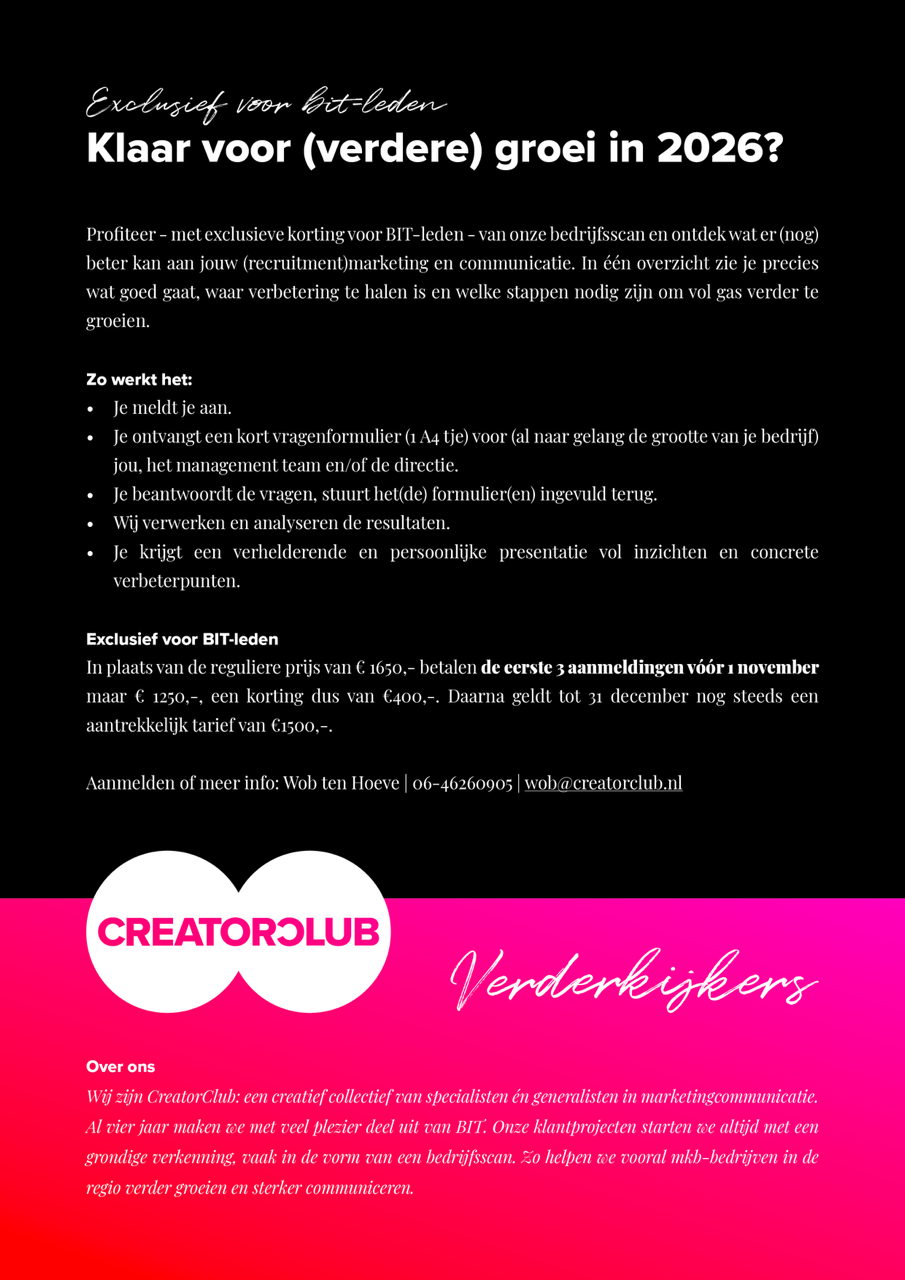 Wij zijn CreatorClub: een creatief collectief van specialisten én generalisten in marketingcommunicatie. Al vier jaar maken we met veel plezier deel uit van BIT. Onze klantprojecten starten we altijd met een grondige verkenning, vaak in de vorm van een bedrijfsscan. Zo helpen we vooral mkb-bedrijven in de regio verder groeien en sterker communiceren.