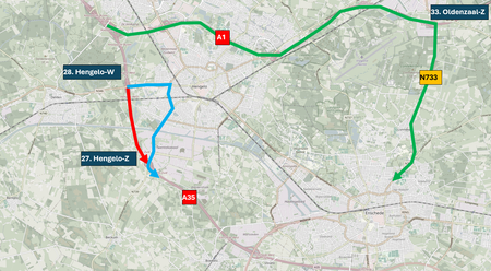 Hoofdrijbaan A35 afgesloten tussen aansluiting 28 Hengelo-West en aansluiting 27 Hengelo-Zuid (zie rode figuur 2).