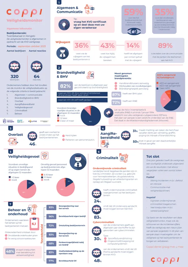 De resultaten van dit onderzoek zijn in een infographic weergegeven. De aanbevelingen (tips waarmee het bedrijventerrein veiliger gemaakt kan worden) zijn verwerkt in het nieuwe plan van aanpak met maatregelen voor de komende 3 jaar.