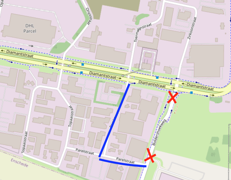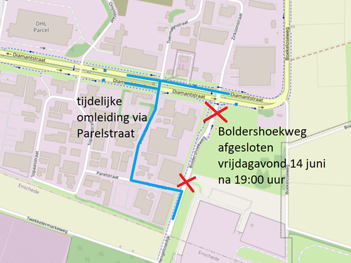 - Op de Haaksbergerstraat, vanaf de kruising met de Diamantstraat in de richting van de A35, zal voorlopig één rijbaan gesloten blijven.