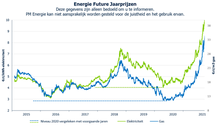 Afbeelding: globaal beeld van prijsontwikkeling elektriciteit en gas 2015 tot medio 2021; Inmiddels liggen de prijzen ver boven deze grafiek.