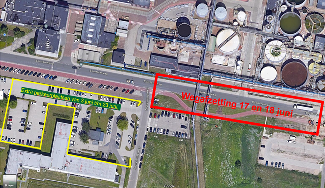 In verband met bovengenoemde wegafsluiting en het grote aantal medewerkers en contractors dat in de Turnaround Salt Plant F werkzaam is, wordt extra parkeerruimte beschikbaar gesteld bij het voormalige Carint gebouw aan de overzijde van de Boortorenweg. Deze parkeerplaatsen zijn beschikbaar voor Nobian van 3 juni tot en met 23 juni 2024.
